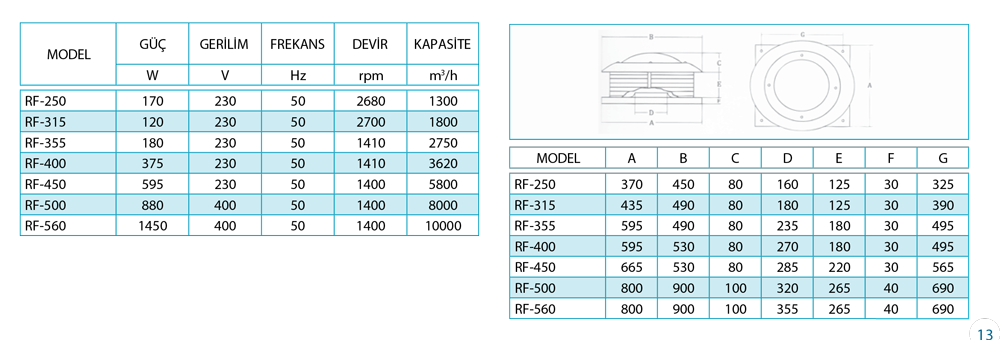 Çeşitli endüstriyel tesisler, depolar, hastaneler, tavuk çiftlikleri. vb. yerlerde kullanıma uygundur. Az kirli ve ortam sıcaklığı max. 60°C'ye kadar olan ortamlarda kullanılmak üzere dizayn edilmiş olan RF serisi çatı fanlarımızın gözdesi elektrostatik toz boyalı sacdan üretilmiştir.
